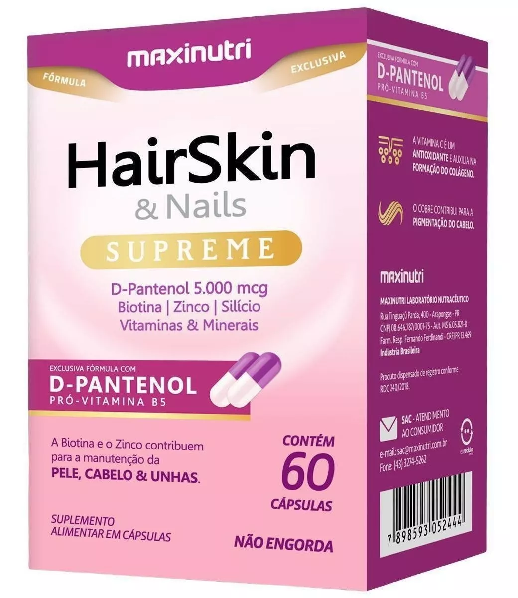 A fórmula exclusiva do HairSkin & Nails Supreme combina o poder do D-Pantenol com nutrientes que auxiliam na manutenção, integridade e saúde dos cabelos, pele e unhas. O D-Pantenol é uma molécula precursora da vitamina B5. Seu alto poder de hidratação e recuperação auxilia a pele, cabelos e unhas a se manterem saudáveis pois estimula o processo de renovação e reparação celular, ativa a hidratação natural, contribui para a produção de colágeno além de aumentar a capacidade de hidratação dos tecidos. As vitaminas e minerais presentes no HairSkin & Nails Supreme exercem importante papel na redução da oleosidade facial, fortalecimento das unhas, pigmentação capilar, diminuição da queda e melhora no crescimento dos cabelos.