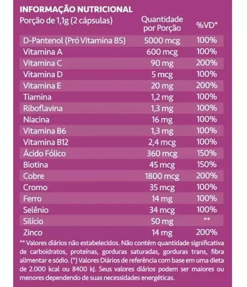 HairSkin & Nails Supreme combina o D-Pantenol com nutrientes que auxiliam na manutenção, integridade e saúde dos cabelos, pele e unhas. O D-Pantenol é uma molécula precursora da Vitamina B5.