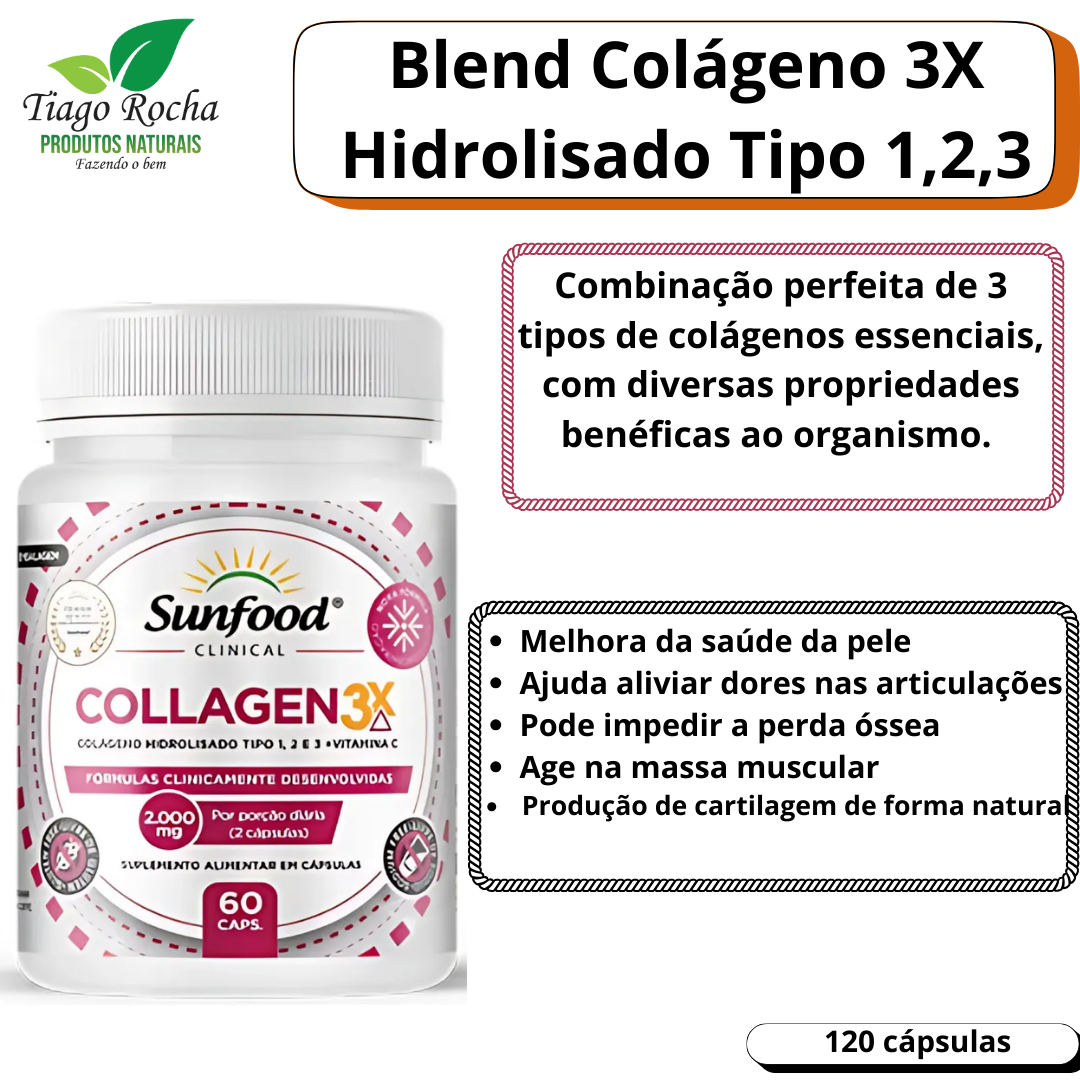 O colágeno em cápsula tipo 1, 2 e 3 é a combinação perfeita de 3 tipos de colágenos essenciais, com diversas propriedades benéficas ao organismo. Portanto, auxilia na restauração, flexibilidade e lubrificação das articulações. Também auxilia na proteção dos ossos, prevenindo a osteoporose, melhorando a produção de cartilagem de forma natural, atua na prevenção do envelhecimento das células e rejuvenesce a pele melhorando a elasticidade e firmeza. Auxilia no fortalecimento de unhas e cabelos. A vitamina C é um potente antioxidante que estimula a produção de colágeno e melhora a absorção desta proteína.