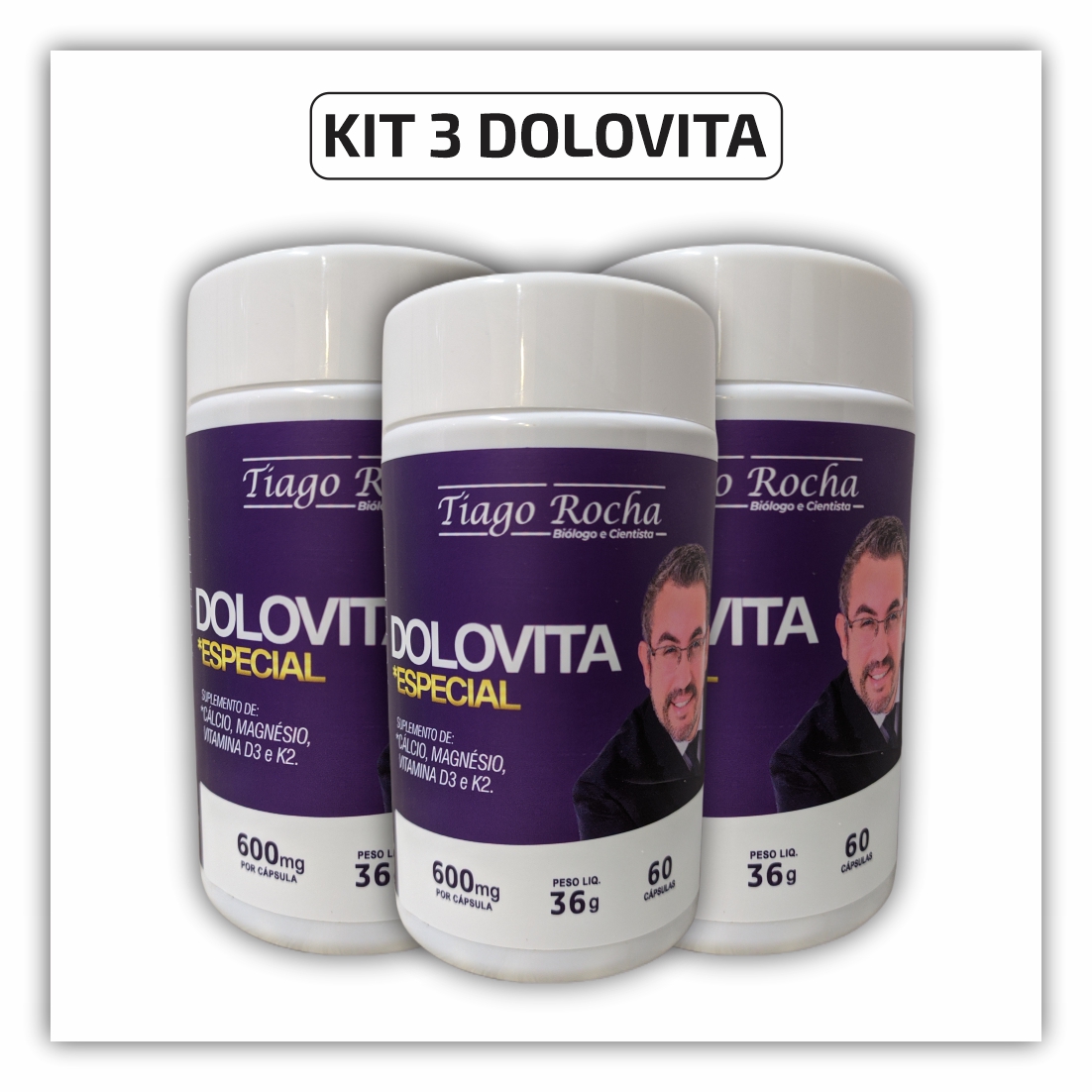 Dolovita D Especial Tiago Rocha é um suplemento alimentar a base de dolomita que é um dos melhores minerais rico em cálcio que existe na terra. Para que o cálcio possa se fixar nos ossos e dentes e não nas artérias do coração gerando risco de problemas de entupimento (infarto), a Dolovita possui além do cálcio e magnésio , a vitamina D3 e a vitamina K2.