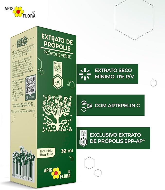 O Extrato de Própolis possui, no mínimo, 15% de extrato seco. Um dos benefícios mais importantes da própolis verde está na sua propriedade anti-inflamatória e sua ação cicatrizante.