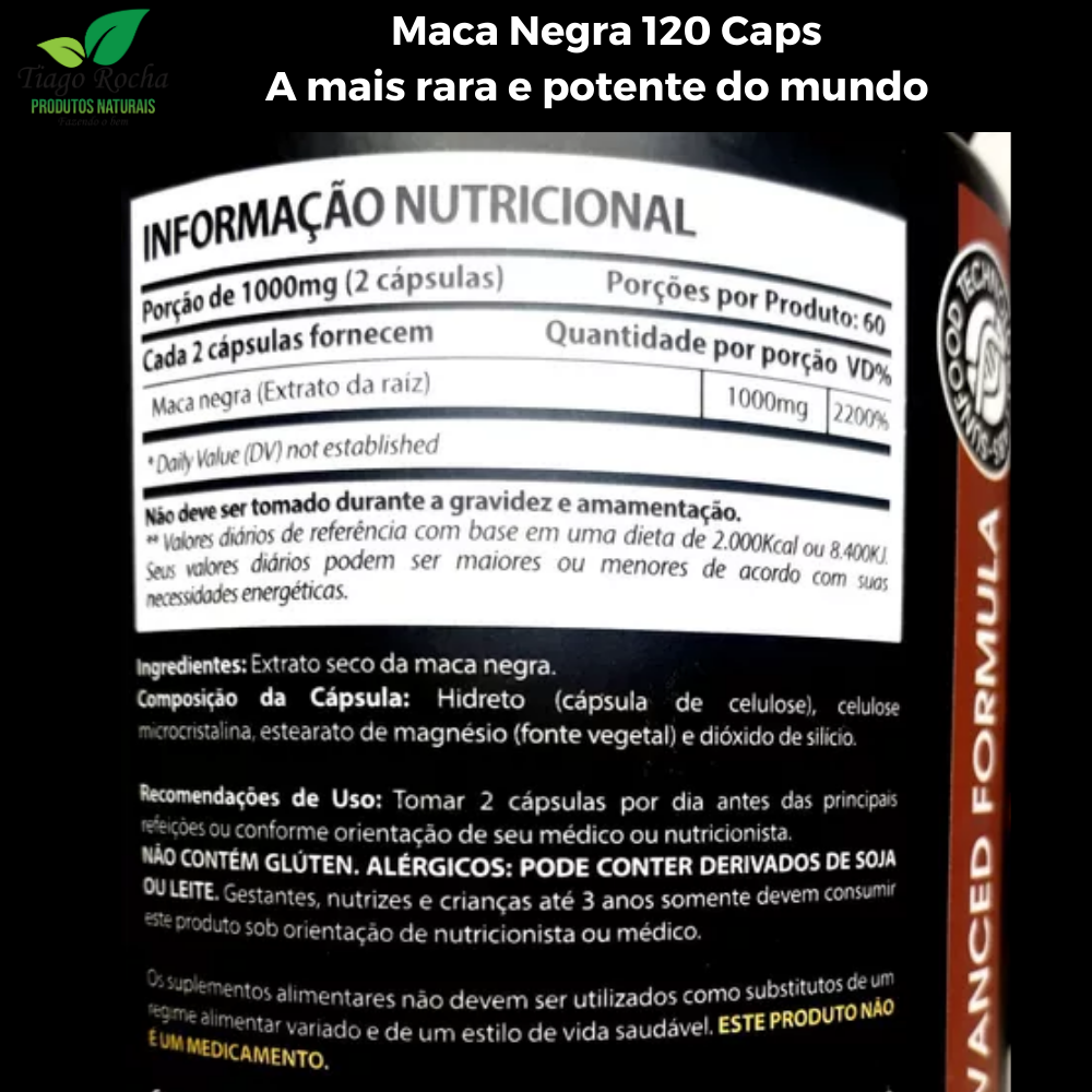 Informação nutricional: cada 2 cápsulas fornecem Maca Negra (extrato da raiz) 1000mg